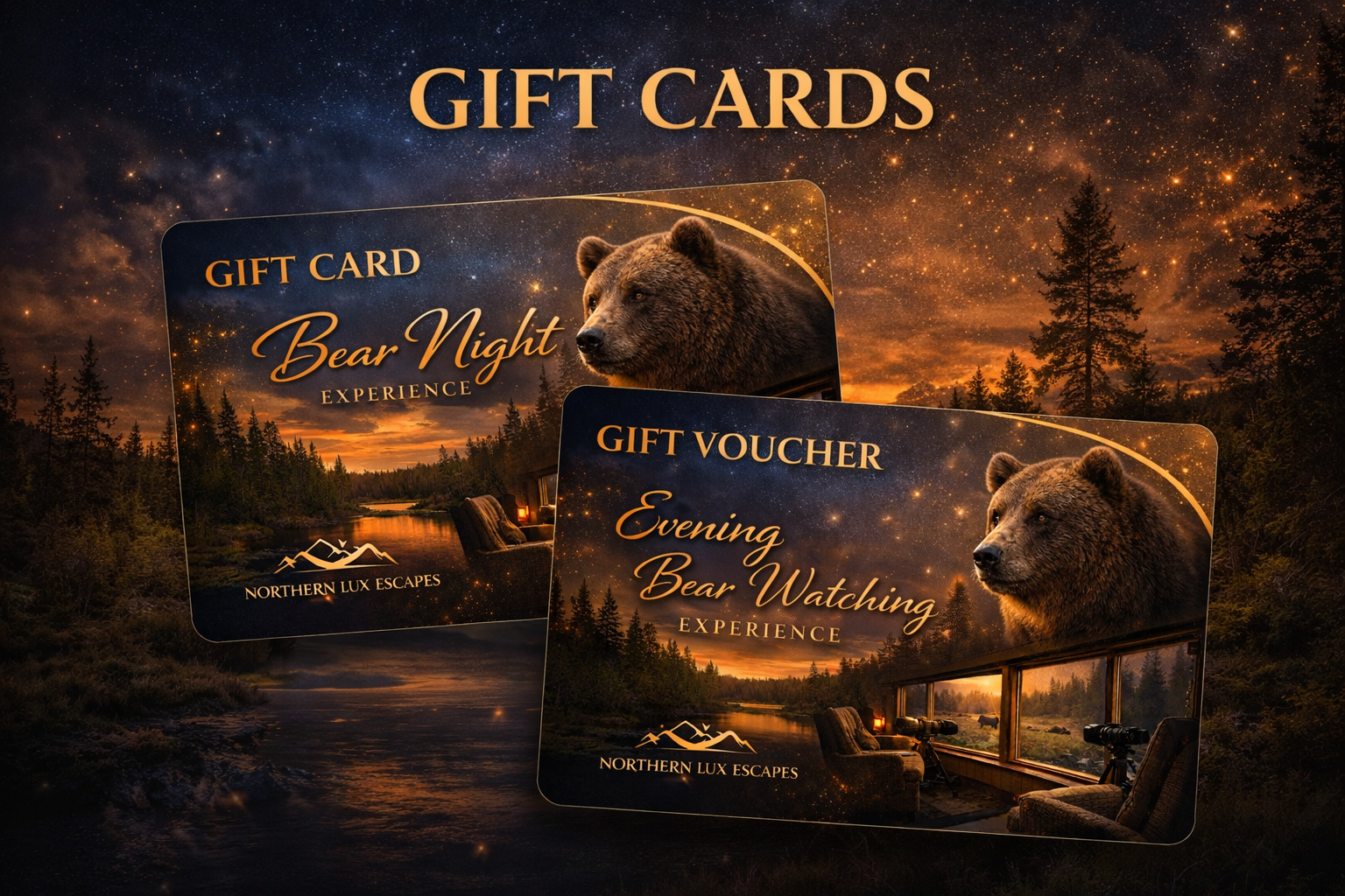 A Northern Lux Escapes Gift Card opens the door to exclusive wildlife encounters in the untouched wilderness of Eastern Finland. From intimate evening visits to full overnight adventures, each experience is shaped by nature and delivered with refined comfort.